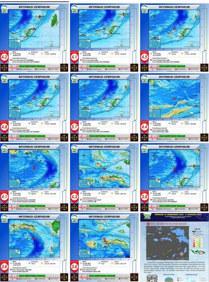 AMBON,MRNews.com,- Pasca gempa bumi tektonik 7,5 SR, Selasa (10/1) pukul 02.47 WIT yang terjadi di Maluku dan terdampak ke wilayah Kabupaten Kepulauan Tanimbar (KKT) dan Maluku Barat Daya (MBD), sebanyak 12 gempa susulan telah terjadi.
