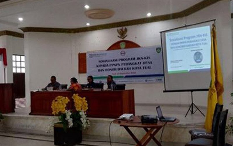 TUALMRNews. – Dalam upaya meningkatkan cakupan kepesertaan demi terwujudnya Universal health Coverage (UHC) di Tahun 2019, BPJS Kesehatan Kota Tual bekerja sama dengan Tim Verifikasi dan Validasi Data jamkesda Kota Tual menyelenggarakan Sosialisasi Program JKN-KIS kepada Pegawai Pemerintah Non Pegawai Negeri (PPNPN) Honorer Daerah dan Perangkat Desa, Kamis (13/9) di Tual. Sosialisasi ini hadiri sekitar 200 orang yang terdiri dari Seluruh Pimpinan dan kepala Bidang Kepegawaian Organisasi Perangkat Daerah (OPD) serta Seluruh Perangkat Desa yang ada di 2 Kecamatan di Kota Tual. Kecamatan tersebut adalah Kecamatan Pulau Dullah Selatan dan Kecamatan Pulau Utara.