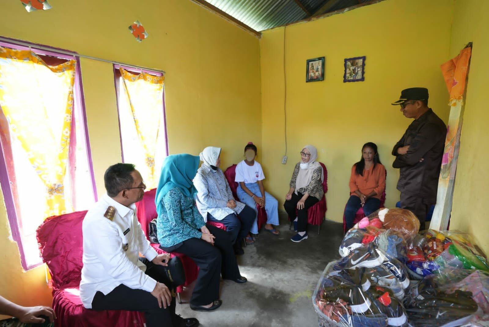Duduk disamping FP, Mensos Risma menggenggam erat tangan siswi kelas 6 SD itu sembari menyemangatinya dan keluarganya agar dapat bangkit kembali dari keterpurukan.