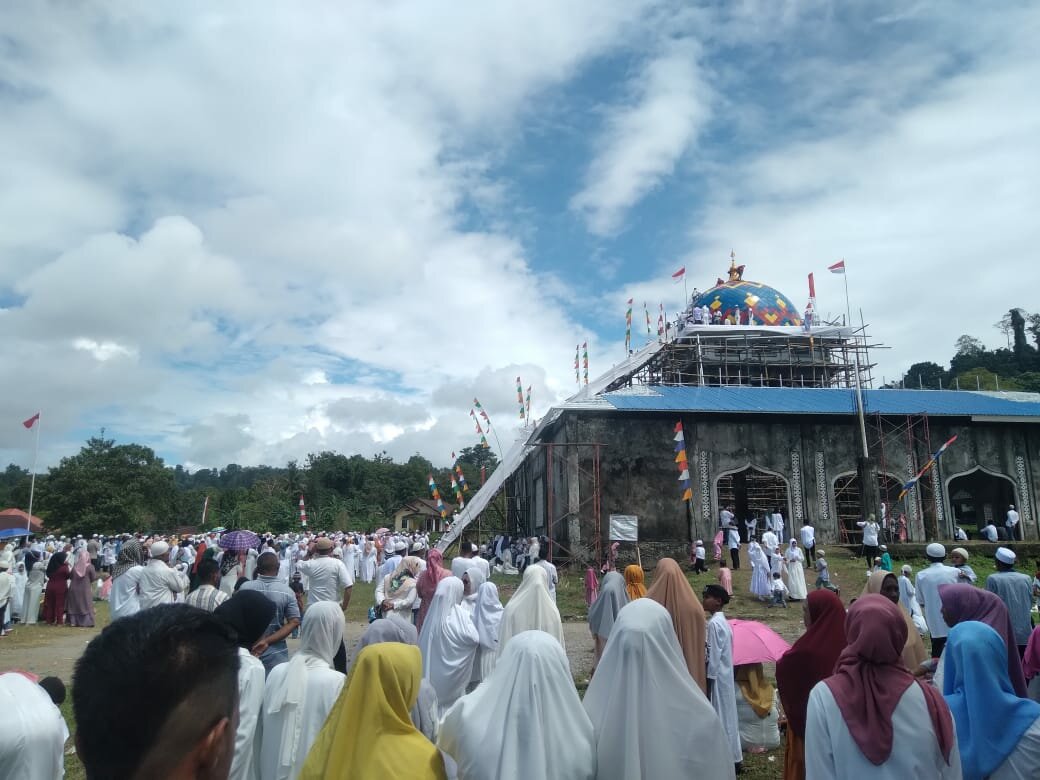 Seruan Sholawat dan Takbir yang dikumandangkan ribuan warga tiba-tiba terhenti, ketika Tiang Alif telah berada pada puncak paling tinggi Mesjid Baru Negeri Latu.