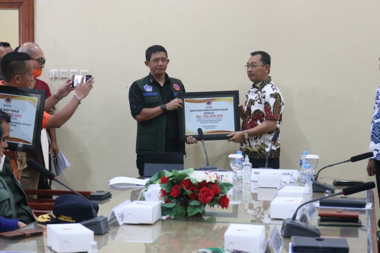 Dana itu diserahkan Kepala BNPB Letjen TNI. Suharyanto kepada Wakil Gubernur (Wagub) Maluku Barnabas Orno dan Penjabat Bupati KKT, Daniel Indey serta perwakilan Bupati MBD di ruang VIP Bandara Pattimura Ambon, Kamis (12/1).