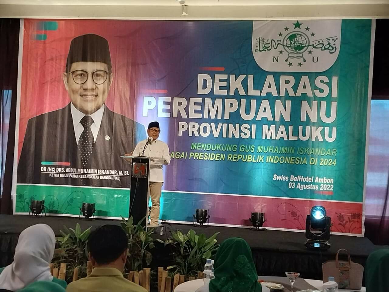 AMBON, MRnews.Com.- Kehadiran Ketua Umum Partai Kebangkitan Bangsa (PKB), Abdul Muhaimin Iskandar atau Gus Muhaimin di Kota Ambon mendapat dukungan penuh perempuan Nahdatul Ulama (NU) Provinsi Maluku sekaligus deklarasi Perempuan NU yang digelar di salah satu hotel di Kota Ambon, Rabu (3/8).