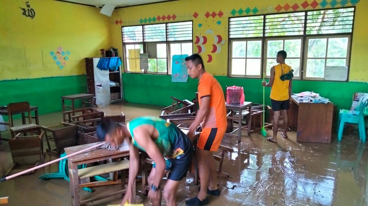 Danyon bersama para prajurit bergotong royong dengan masyarakat membersihkan sisa- sisa sampah akibat banjir yang berada di sekitar rumah warga dan lokasi sekolah.