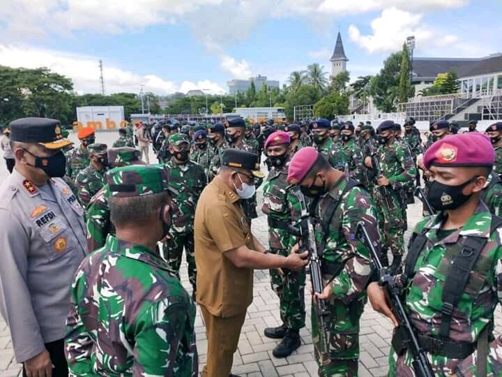 Gubernur Maluku Murad Ismail. Kasdam XVI/Pattimura Brigjen TNI Gabriel Lema memimpin apel kesiapan.